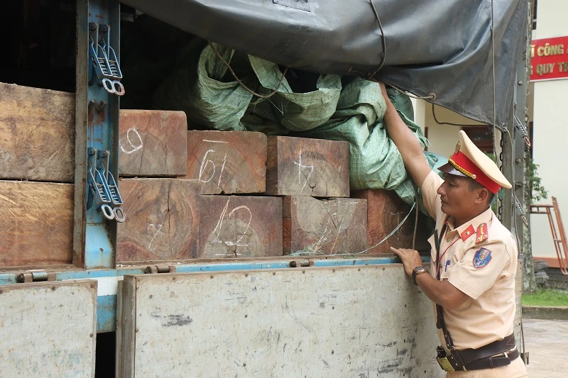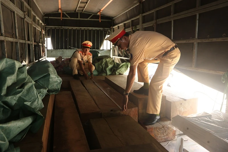 Cảnh sát phát hiện xe chở gỗ không rõ nguồn gốc. Ảnh Q.MINH