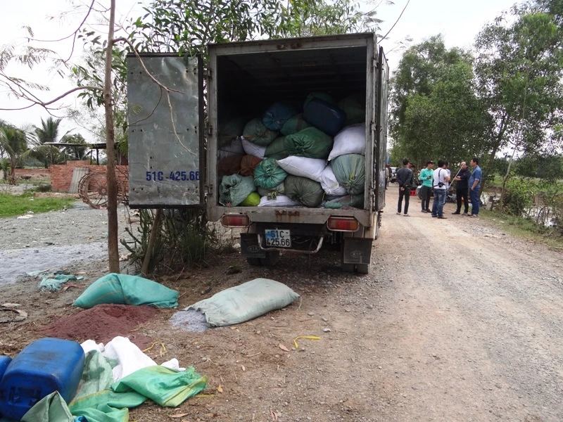 Qua nhiều ngày theo dõi, sáng 13-1, Đội 5, Phòng cảnh sát môi trường Công an TP.HCM (PC49) bắt quả tang một xe tải chở chất thải đem đổ ở một khu đất trống gần kênh Thầy Cai - An Hạ (thuộc địa bàn xã Xuân Thới Sơn, huyện Hóc Môn, TP.HCM).