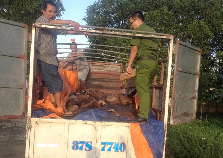 Tài xế Khoa không xuất trình được giấy kiểm dịch và giấy tờ liên quan lô hàng da trâu, bò trên. Sau khi kiểm tra, công an phát hiện 4 tấn da trâu, bò trên xe đang bốc mùi hôi thối nên đã cho tịch thu.