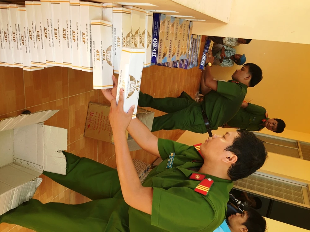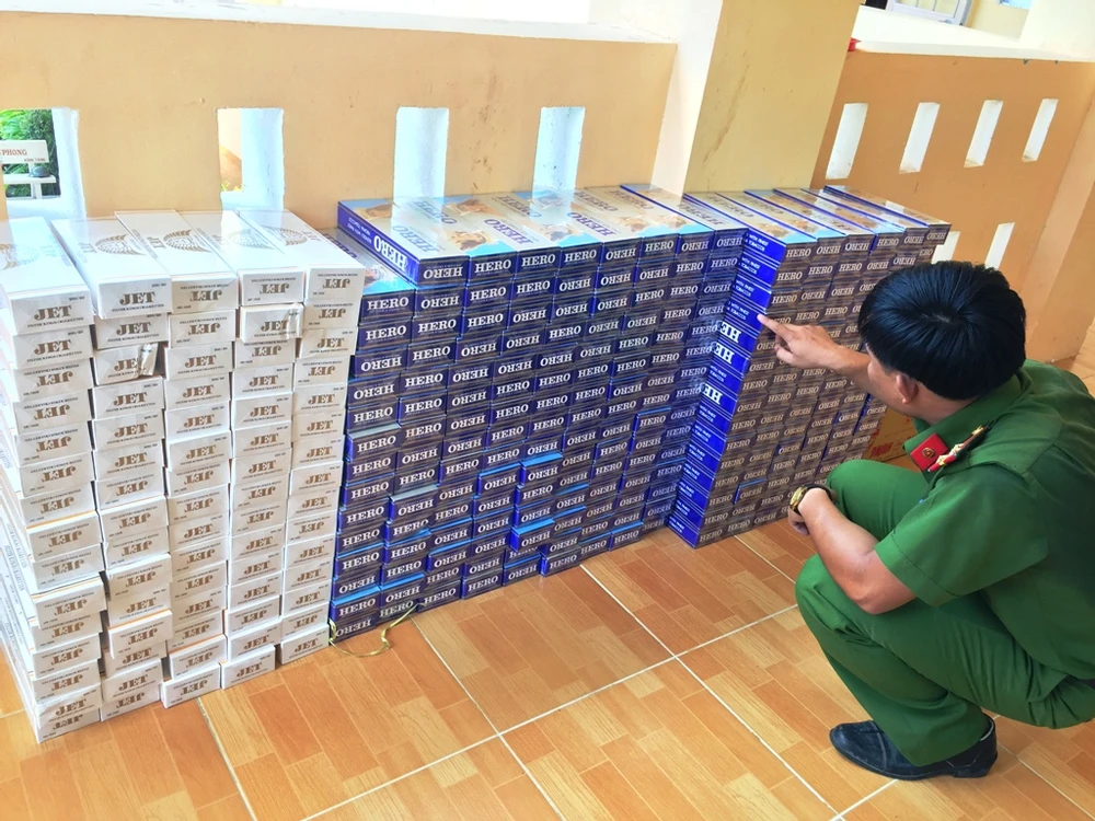 Công an kiểm đếm số lượng thuốc lá ngoại nhập lậu. Ảnh: XUÂN MI