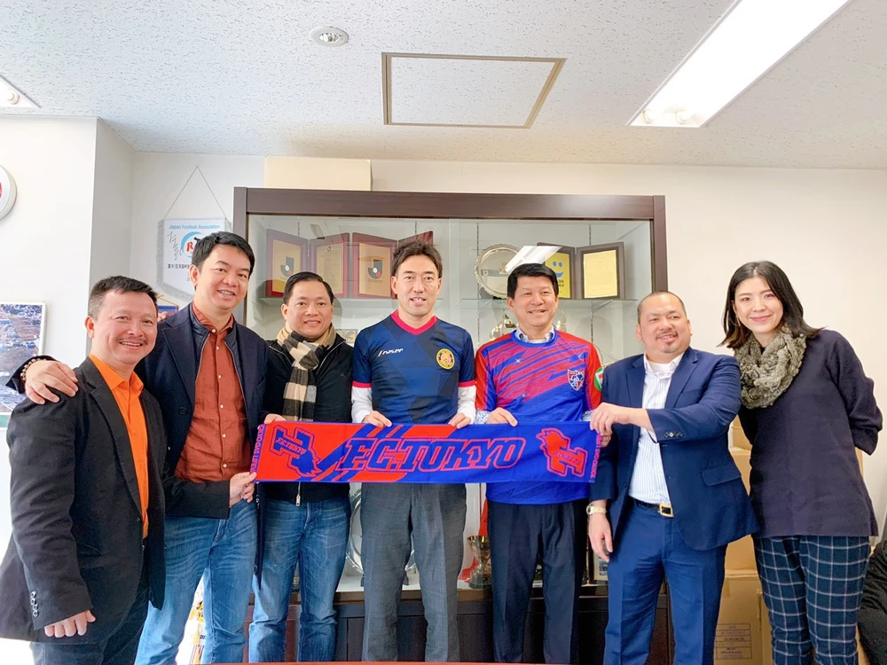 Bầu Bình (thứ hai từ phải sang) cùng các cộng sự sang Nhật bắt tay với FC Tokyo và mời chuyên gia Kenzo (giữa). Ảnh: ANH HOÀNG.