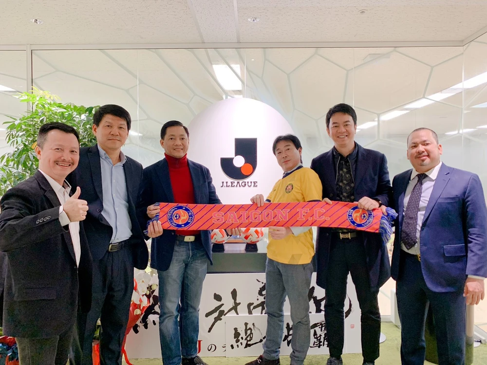 Ban lãnh đạo Saigon FC và ông Konishi (áo vàng) Tổng giám đốc J-League. Ảnh: ANH HOÀNG.