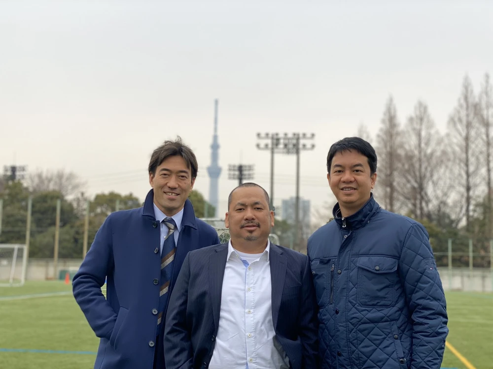 Bầu Bình (giữa) và bầu Minh (phải) với ông Fujiwara Kenzo, Giám đốc kinh doanh toàn cầu FC Tokyo tại Học viện bóng đá FC Tokyo.