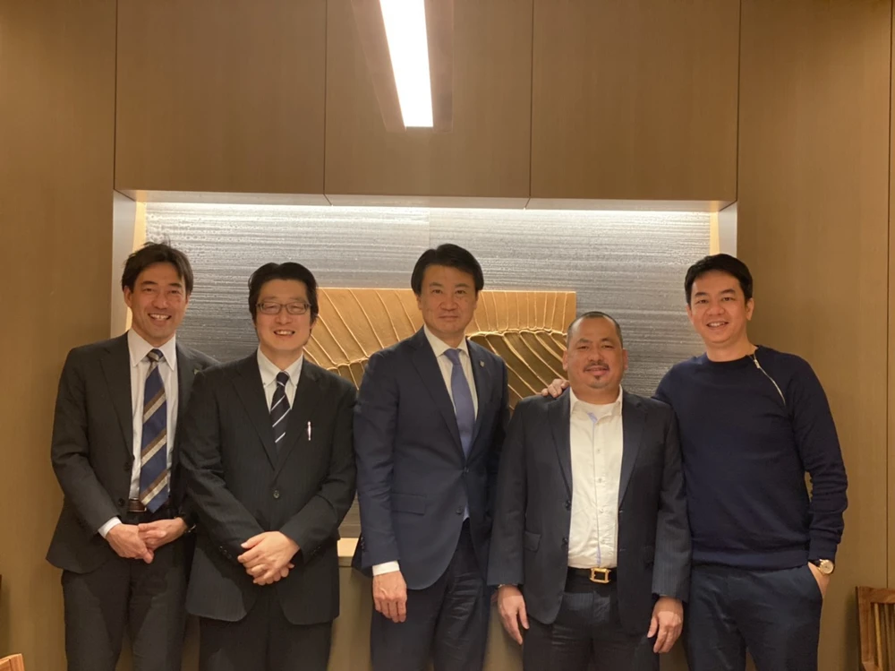 Bầu Bình và bầu Minh (thứ 4 và 5 từ trái qua) với ông Naoki Ogane, Chủ tịch FC Tokyo (giữa) trong chuyến công tác ở Nhật Bản. Ảnh: ANH HOÀNG.
