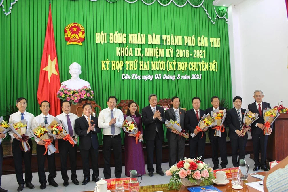 Lãnh đạo Thành ủy, HĐND, UBND TP Cần Thơ tặng hoa cho những người vừa được miễn nhiệm và nhận nhiệm vụ mới. Ảnh: HP