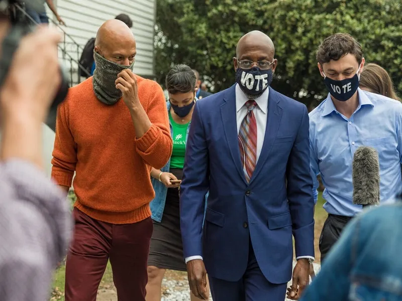 Hai đảng viên Dân chủ ở Georgia tranh cử Thượng viện là ông Raphael G. Warnock (ở giữa) và ông Jon Ossoff (bên phải). Ảnh: NEW YORK TIMES