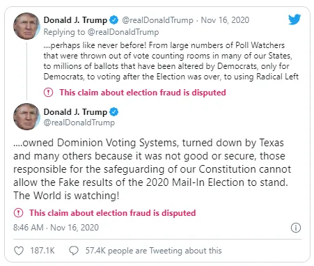 Tuyên bố trên được đưa ra sau khi luật sư chiến dịch Jay Sekulow của ông Trump yêu cầu đếm lại phiếu ở từng bang có sử dụng phần mềm Dominion mà ông cho rằng đã chuyển sai 6.000 phiếu bầu cho phía Dân chủ tại một hạt của bang Michigan trong cuộc bầu cử.