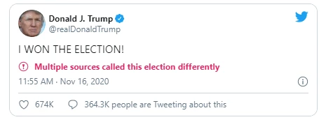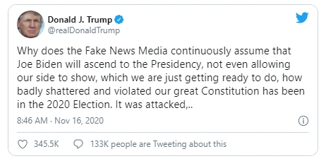 Tổng thống Trump cho rằng ông Biden thắng "vì đã xảy ra gian lận trong cuộc bầu cử", thêm rằng ông "không thừa nhận bất cứ điều gì", vì ông Biden chỉ thắng "trong mắt các phương tiện truyền thông, vốn luôn đưa ra những tin tức giả mà thôi".