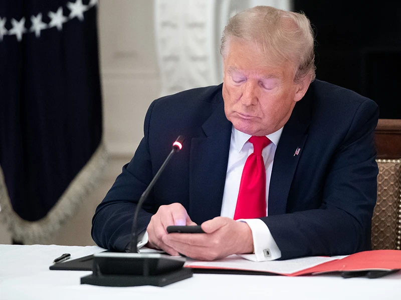 Tổng thống Donald Trump sử dụng điện thoại trong một cuộc họp báo ở Nhà Trắng vào tháng 7-2018. Ảnh: CNBC
