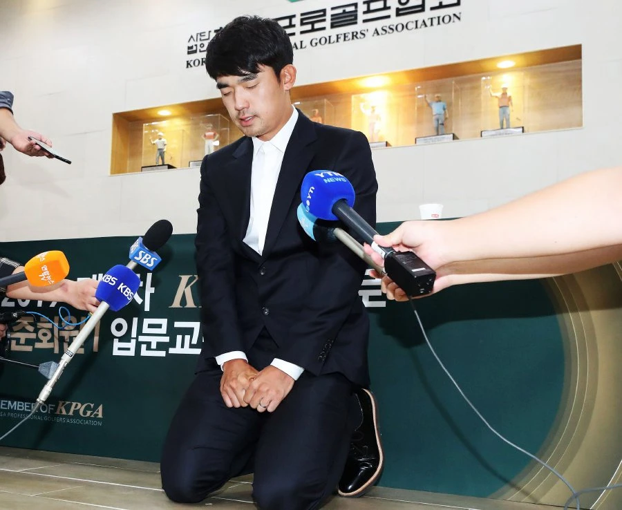 Golf thủ Kim Bi-o quỳ gối xin lỗi công chúng Hàn Quốc. ẢNH: AFP