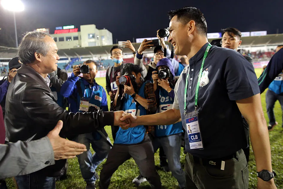 Bầu Đức sau nhiều năm không đến sân bóng thì giờ đã siêng đến sân hơn và chúc mừng HLV Kiatisak sau những chiến thắng như chẻ tre của HA Gia Lai. Ảnh: PHƯƠNG NGHI