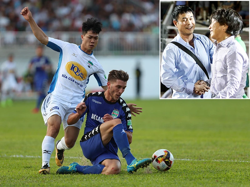 HA Gia Lai của bầu Đức (ảnh lớn) đang lên chân với năm trận bất bại trong khi HLV Miura ngán ngẩm sau năm trận không biết thắng. Ảnh: HUY PHẠM
