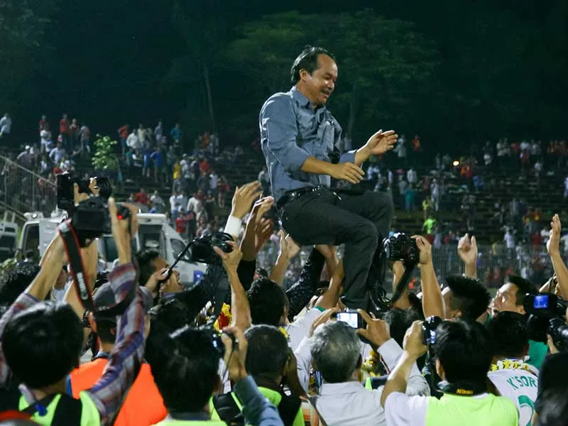 Bầu Đức từng sung sướng và được tung hô khi thế hệ HA Gia Lai ở tuổi 19 của ông đánh bại đội U-21 Thái Lan và ông mong SEA Games 29 sẽ có sự thay đổi về thành tích lẫn lối chơi đẹp. Ảnh: HOÀNG HÙNG