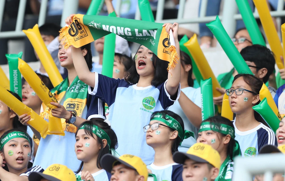 Cổ động viên ĐH Nông Lâm cuồng nhiệt trên khán đài. Ảnh: ANH THÔNG.