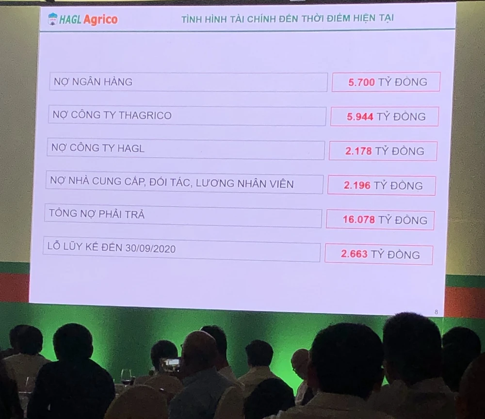 Tính đến ngày 30-11-2020, HAGL Agrico còn nợ ngân hàng 5.700 tỉ đồng, nợ THAGRICO 5.994 tỉ đồng, nợ HAGL 2.187 tỉ đồng, nợ phải trả nhà cung cấp, đối tác, nhân viên 2.196 tỉ đồng. Tổng các khoản nợ phải trả là 16.078 tỉ đồng và lỗ lũy kế đến 30-9-2020 là 2.663 tỉ đồng.