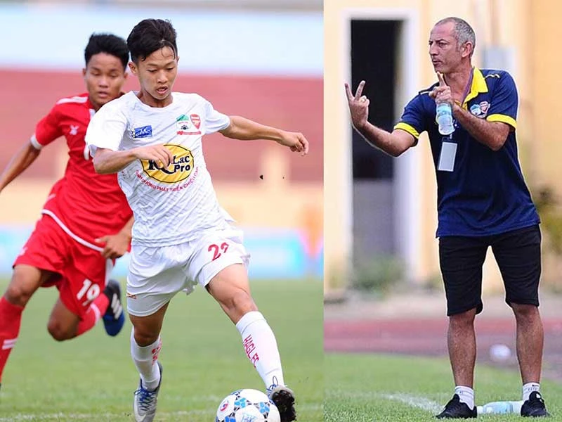 HLV Guillaume (phải) nắn nót cho các cầu thủ U-19 HA Gia Lai nhưng thực chất họ chỉ ở tuổi 16-17. Ảnh: TRƯƠNG TÚ
