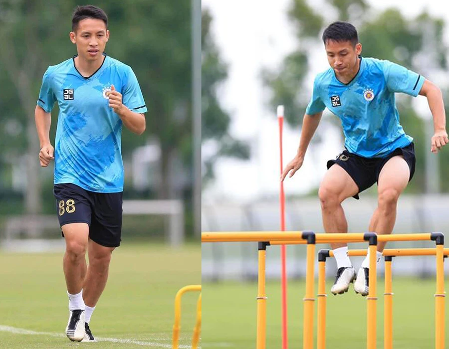 Hùng Dũng đang bước đầu chập chững tập luyện sau gần tám tháng điều trị. Ảnh: CLB HÀ NỘI