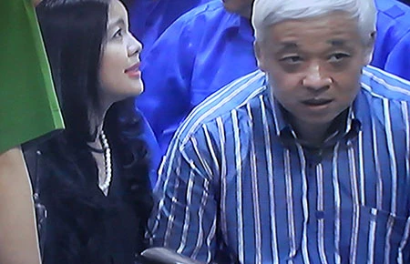 Bị cáo Nguyễn Đức Kiên với vợ trong giờ giải lao tại tòa. Ảnh: TL