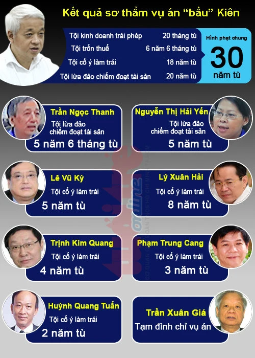 | Trước đó, Tòa sơ thẩm đã tuyên án bị cáo Nguyễn Đức Kiên (nguyên chủ tịch hội đồng đầu tư Ngân hàng ACB, nguyên phó chủ tịch hội đồng quản trị Ngân hàng ACB, nguyên phó chủ tịch hội đồng sáng lập ACB) như sau: 20 tháng tù về tội kinh doanh trái phép,18 năm tù về tội cố ý làm trái, 6 năm 6 tháng tù về tội trốn thuế và 20 năm tù về tội lừa đảo chiếm đoạt tài sản. Tổng hợp hình phạt chung của bị cáo Kiên là 30 năm tù. |