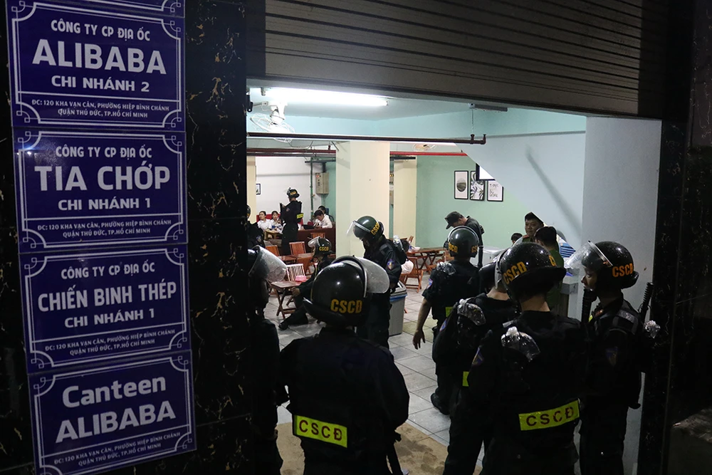 Công an khám xét trụ sở chính của Công ty CP Địa ốc Alibaba trên đường Phạm Văn Đồng và bắt Nguyễn Thái Lĩnh, giám đốc công ty. Ảnh: CA