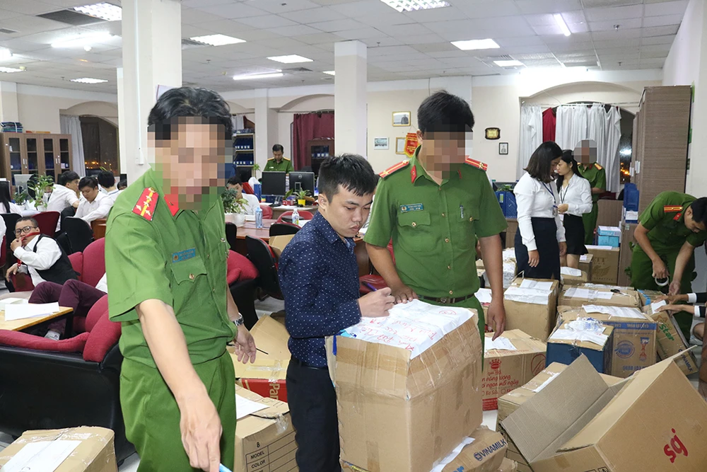 Công an kiểm tra, khám xét hàng loạt trụ sở chi nhánh Công ty CP Địa ốc Alibaba. Ảnh: CA