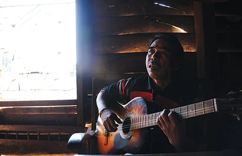 Y Phôn ôm đàn hát ở quê nhà, trong căn nhà anh về “làm chồng” ở buôn Dlei Yang bây giờ.