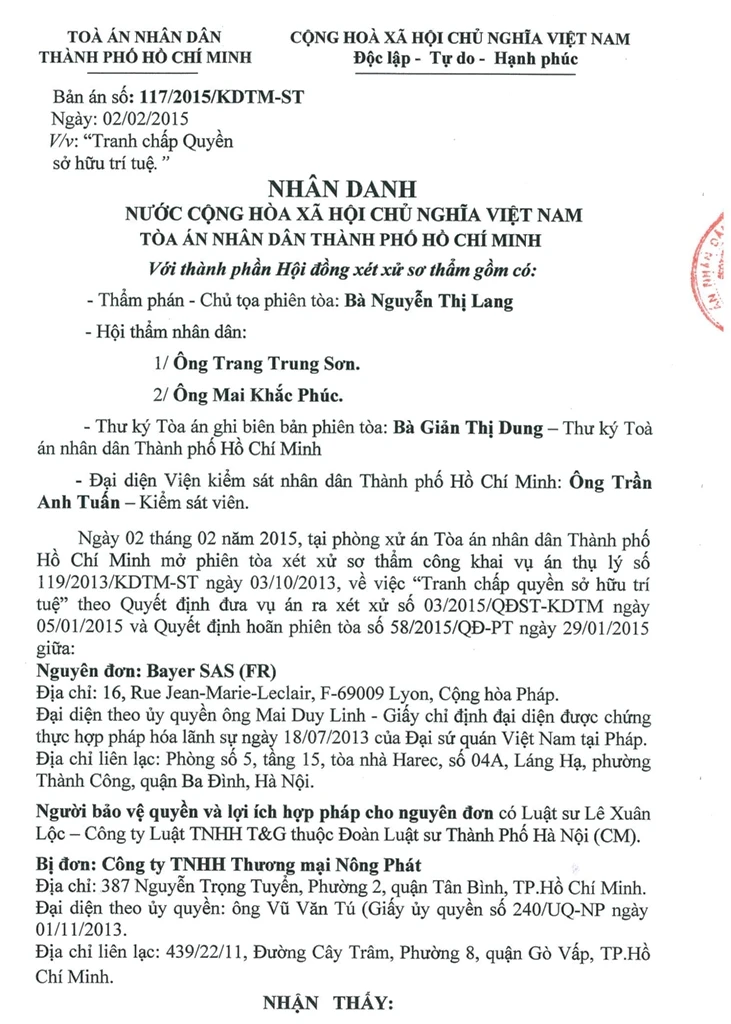 Ngày 2-2-2015, TAND TP.HCM đã xử sơ thẩm vụ tranh chấp quyền sở hữu trí tuệ này. HĐXX đã chấp nhận các yêu cầu của Bayer SAS, buộc Nông Phát phải ngưng sản xuất, đóng gói, phân phối, tàng trữ, lưu thông, chào hàng, quảng cáo sản phẩm thuốc trừ sâu rầy có tên gọi “SESPA GOLD”; chấm dứt việc nhập khẩu nguyên liệu, phụ gia 2 thành phần sản xuất ra sản phẩm “SESPA GOLD” và “HUMMER”; thu hồi sản phẩm “SESPA GOLD”; rút lại hồ sơ đăng ký sản phẩm này tại Cục Bảo vệ thực vật; không được quyền đăng ký tiếp sản phẩm nào có chứa hai thành phần Fipronil và Imidacloprid. Đồng thời, HĐXX cũng buộc Nông Phát phải thanh toán cho Bayer SAS chi phí luật sư gần 60 triệu đồng và xin lỗi công khai Bayer SAS trên một số phương tiện thông tin đại chúng.