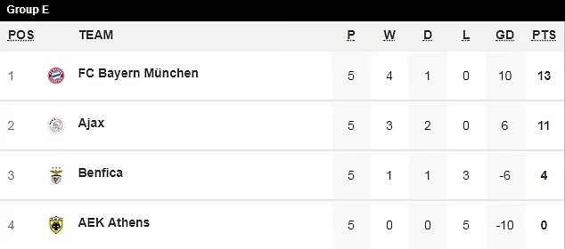 Bảng E Champions League xem như đã an bài với hai chiếc vé lọt vào vòng 16 đội thuộc về Bayern Munich và Ajax. Hai CLB đến từ Đức và Hà Lan đã biết tận dụng tốt cơ hội để giành chiến thắng trước những ở bảng E là AEK Athens và Benfica.