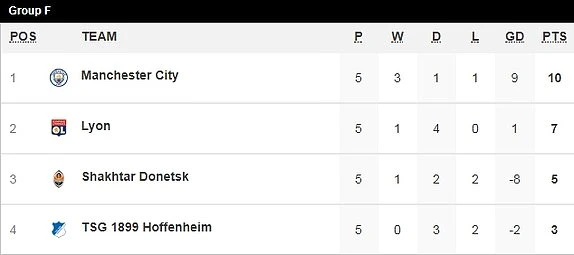 Với kết quả hòa trên đất Pháp, Man. City vẫn nắm ngôi đầu bảng F với 10 điểm đồng nghĩa “nửa xanh” thành Manchester nắm chiếc vé đầu tiên vào vòng trong của bảng F. Trong khi đó Lyon tuy đứng thứ hai những vẫn chưa thật sự an toàn, bởi Shakhtar Donetsk sau trận thắng kịch tính 3-2 trước Hoffenheim hiện đứng thứ ba với 5 điểm. Đồng nghĩa với việc ở lượt trận đấu cuối Lyon và Shaktar Donetsk rơi vào cảnh sống còn.