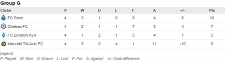 Tại bảng G, HLV Mourinho tạm thời giảm sức ép mất ghế khi Chelsea của ông thắng Dinamo Kiev 2-1. Willian đã trở thành người hùng của Chelsea và cứu chiếc ghế của ông thầy Mourinho khi góp công lớn vào cả hai bàn thắng của Chelsea. Đầu tiên, ở phút 34, pha tạt bóng khó chịu bên cánh phải của Willian đã khiến hậu vệ Dragovic lúng túng đánh đầu tung lưới nhà.