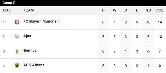 Với kết quả hòa 3-3, cả Ajax và Bayern Munich đều giành quyền đi tiếp, “hùm xám” có được 14 điểm sau khi kết thúc vòng bảng. Trong khi đó Ajax có được cho mình tấm vé thứ hai với 12 điểm. Cặp đấu còn lại bảng E Benfica giành chiến thắng tối thiểu 1-0 trên sân nhà trước đối thủ AEK Athens.