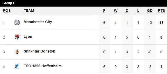 Tại bảng F, Man. City cũng kết thúc lượt trận cuối vòng bảng với chiến thắng tối thiểu 2-1 trước đối thủ Hoffenheim. Phút 16 Hoffenheim có bàn thắng mở tỉ số ở phút 16 trên chấm 11 m sau khi trung vệ Laporte bên phía Man. City phạm lỗi trong vòng cấm. Kramaric không bỏ lỡ cơ hội thực hiện thành công đưa Hoffenheim vươn lên dẫn trước.