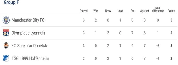 Với chiến thắng 3-0 trước Shakhtar Donetsk, Man City vượt lên dẫn đầu bảng F với 6 điểm. Vị trí thứ hai thuộc về Lyon khi đại diện của nước Pháp có trận hòa kịch tính trên sân nhà của Hofenheim với tỉ số 3-3. Với kết quả hòa này, Lyon có được 5 điểm sau ba lượt đấu.