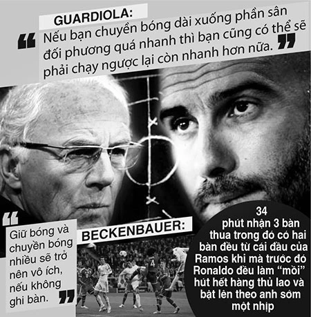 Trong khi đó HLV Alcelotti lại thiết lập hàng phòng ngự kiểu Catenaccio của Ý nhưng phần phản công thì rất chủ động. Bộ tứ Di Maria - C. Ronaldo - Bale - Benzema luôn gây nguy hiểm nhưng hung thần của Bayern lại chính là trung vệ Ramos. Người mà hai lần bật cao đánh đầu thành bàn đều nhờ cái đầu “mồi” của Ronaldo hút hết hàng phòng ngự đối phương.