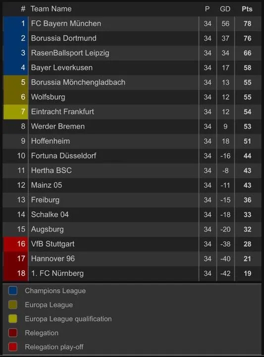 Kết thúc vòng đấu cuối cùng Bundesliga, Bayern Munich đăng quang ngôi vương với 78 điểm, đội xếp thứ hai là Dortmund với 76 điểm, hai suất tham dự Champions League còn lại thuộc về RB Leipzig và Bayer Leverkusen. Ba đội giành quyền chơi Europa League là Borussia Monchengladbach, Wolfsburg và Eintracht Frankfurt.