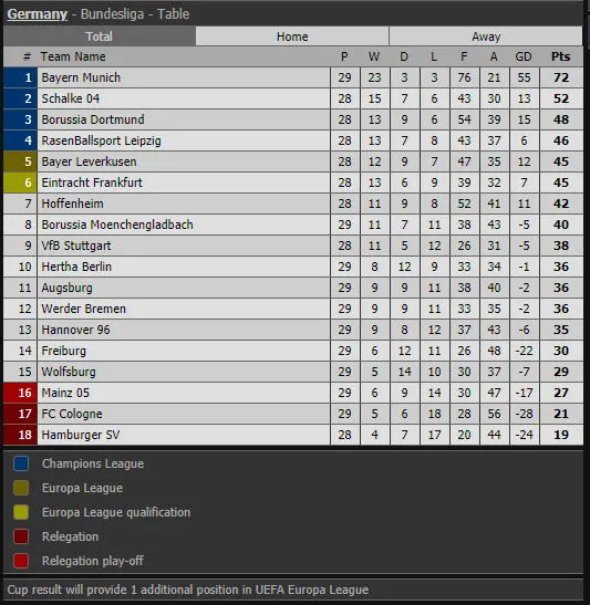 Thắng trận này, Bayern Munich có 72 điểm, hơn đội xếp thứ hai Schalke 04 đến 20 điểm (Schalke đá vòng 29 muộn hơn Bayern hơn một giờ) và chính thức lên ngôi vô địch Bundesliga trước 5 vòng đấu.