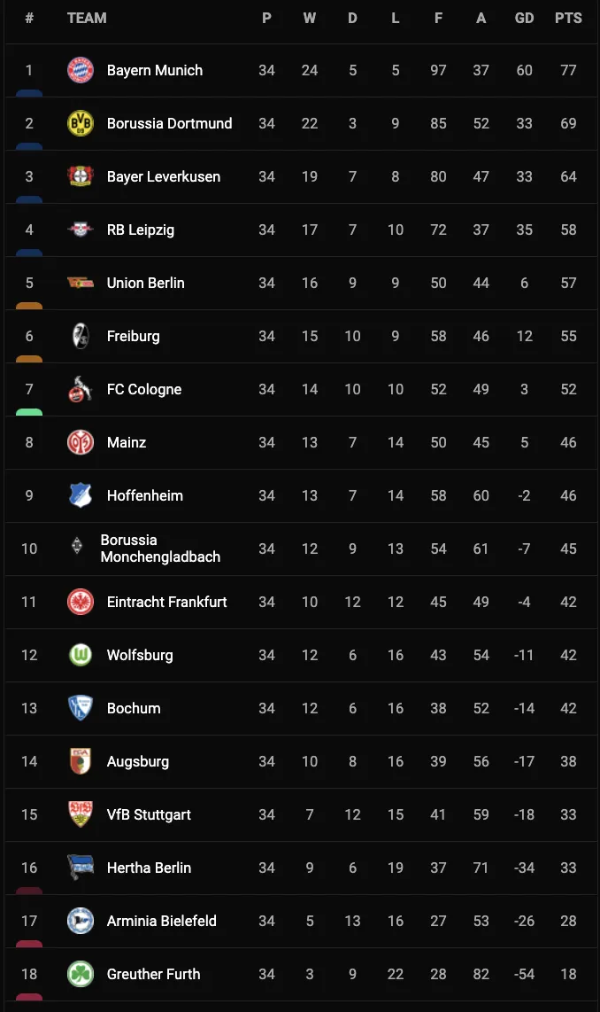 | Kết quả Bundesliga mùa 2021 - 2022Đội vô địch: Bayern Munich Đội tham dự Champions League: Bayern Munich, Borussia Dortmund, Bayer Levekusen, RB Leipzig. Đội dự Europa League: Union Berlin, Freiburg Đội dự Europa Conference League: FC Cologne Đội xuống hạng: Hertha Berlin, Arminia Bielefeld, Greuther Furth |
