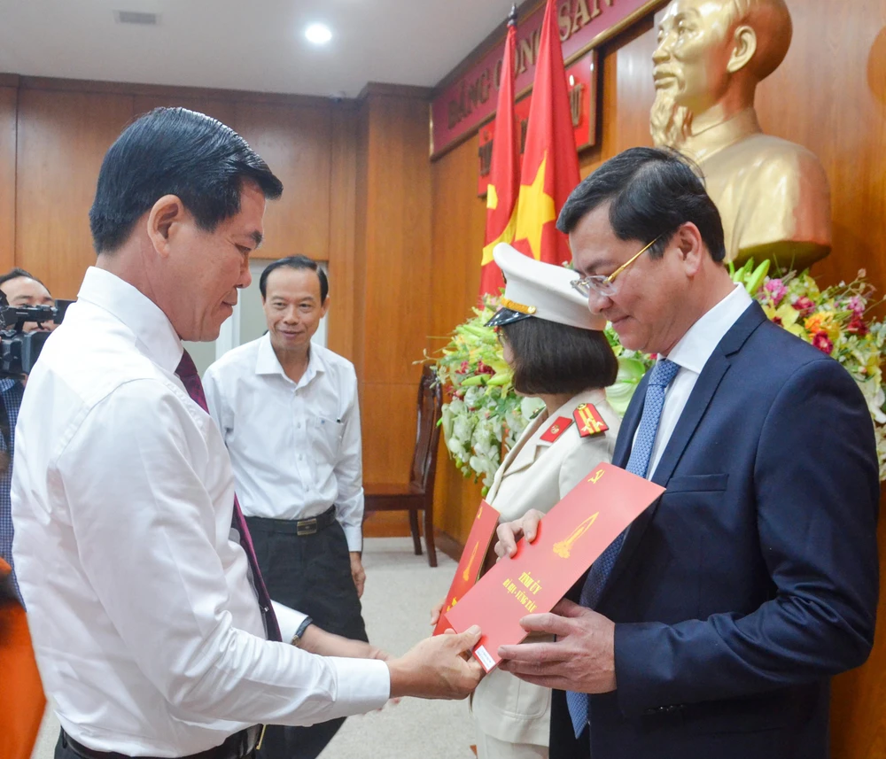 Ông Nguyễn Hồng Lĩnh, Bí thư Tỉnh ủy trao quyết định cho ông Nguyễn Công Vinh (bìa phải).