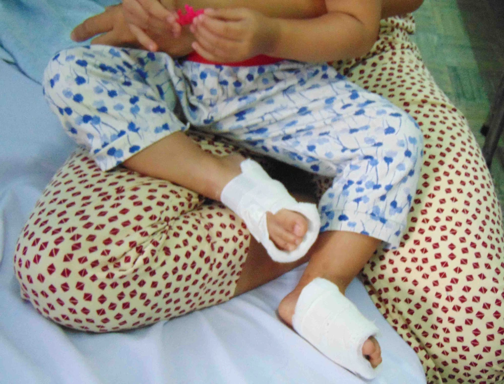 Hai bàn chân bé A. bị bỏng độ 2. Ảnh: TRẦN NGỌC