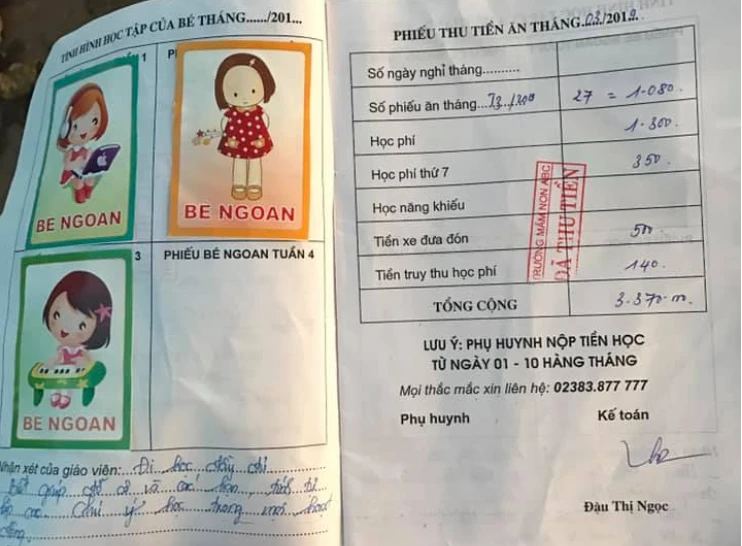 Thông báo cũng đề nghị phụ huynh bé T. đến văn phòng nhà trường để giải quyết. Trong clip, bà nội của bé T. cũng đưa ra quyển sổ liên lạc giữa gia đình và nhà trường có ghi các khoản đóng góp và khẳng định gia đình không nợ tiền...