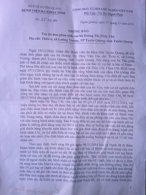 Sau khi sự việc xảy ra, BV Đa khoa tỉnh Tuyên Quang đã thành lập Hội đồng chuyên môn khoa học. Kết luận cho rằng cháu Chi tử vong là do suy hô hấp, viêm phổi nặng, có tiền sử bệnh loạn sản phổi, sức đề kháng yếu cộng virus Rota, bệnh có thể dẫn đến tử vong bất cứ lúc nào.