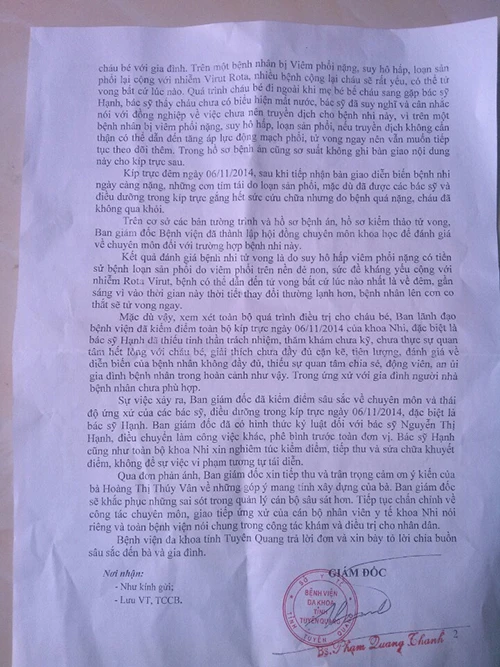 Trước đó, ngày 2-11 chị Hoàng Thị Thúy Vân (ở Tuyên Quang) đưa con gái Hà Thúy Chi (7 tháng tuổi) nhập viện với triệu chứng ho, khó thở. Kết quả chẩn đoán cho thấy cháu Nhi bị viêm phổi nặng, loạn sản phổi. Sáng 6-11, thấy cháu Nhi đi ngoài và sốt 38 độ C, chị Vân đã hai thông báo với BS Hạnh về tình trạng bệnh thì BS cho cháu uống men tiêu hóa và oresol. Sau đó, bà Hạnh chỉ định xét nghiệm phân cho cháu và phát hiện nhiễm virus Rota nên ghi vào bệnh án theo dõi. Kíp trực đêm ngày 6-11, sau khi tiếp nhận bàn giao, bệnh nhi ngày càng nặng, những cơn tím tái do loạn sản phổi, nên cháu đã không qua khỏi.