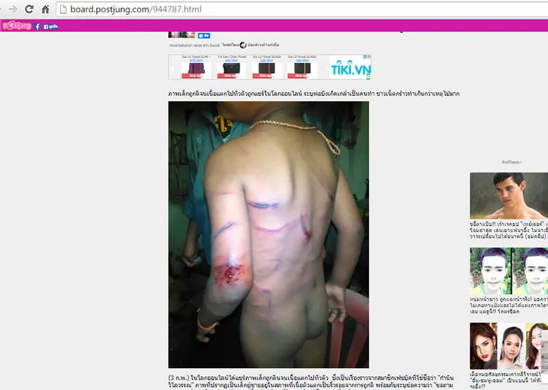 Đến đầu giờ chiều 4-4, tra qua cứu và hỗ trợ của đồng nghiệp, PV báo Pháp Luật TP.HCM phát hiện hình ảnh bé trai được cho là bị cha dượng bạo hành giống hệt hình ảnh đăng trên trang Board.postjung.com của Thái Lan (http://board.postjung.com/944787.html ) và trên trang Board.postjung.com thể hiện hình ảnh đăng tải ngày 3-2.