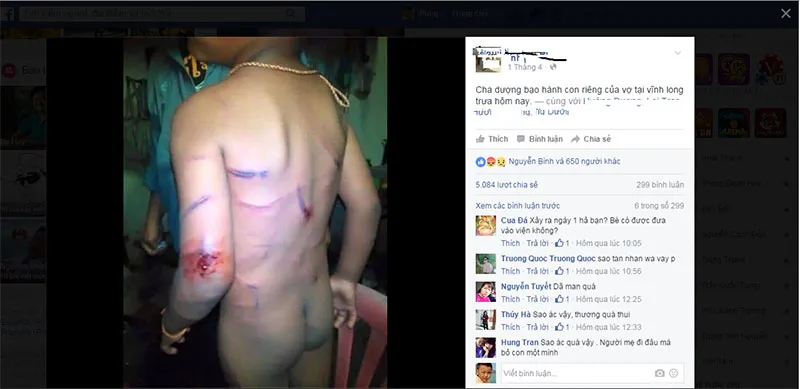 Thông tin kèm theo bức ảnh cho biết cháu bé này bị cha dượng đánh và địa điểm là khu vực Công viên ở phường 1, TP Vĩnh Long (tỉnh Vĩnh Long).