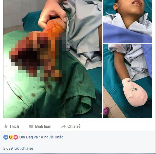 Tai nạn thương tâm khiến bàn tay phải của em Y bị nát. Ảnh nguồn fceboook.