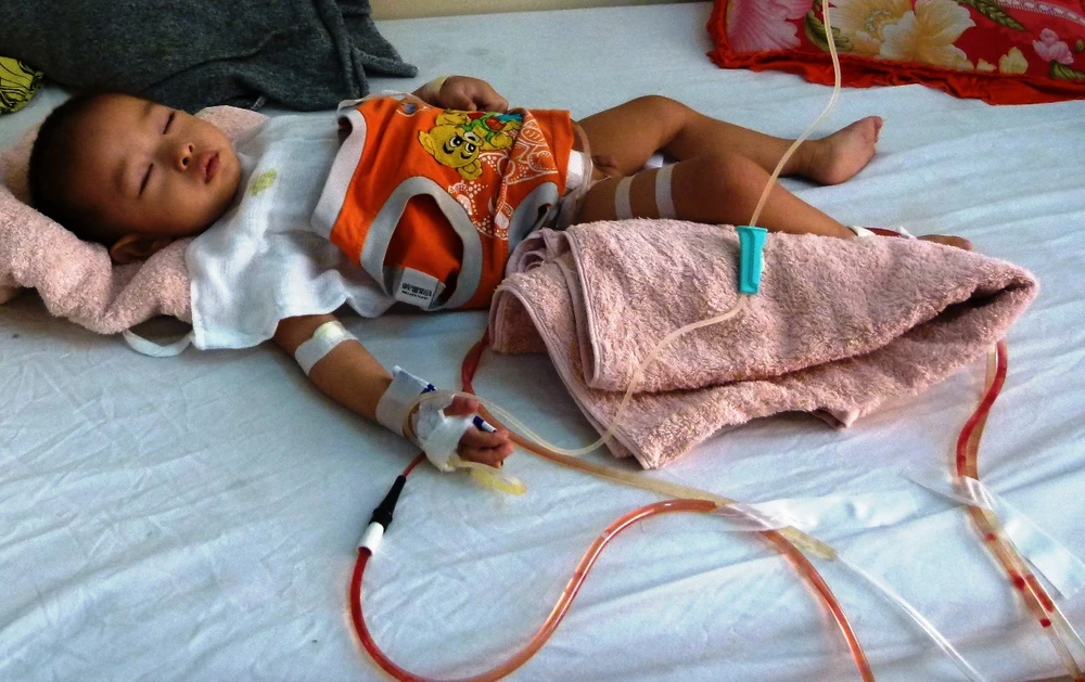 Bé Đức nằm trong viện khi bị cắt nhầm bàng quang. Ảnh: Công Thi.