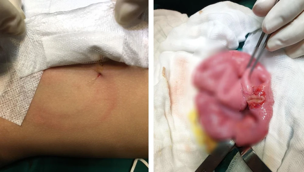 Tại đây, các bác sĩ (BS) ghi nhận bé bị sốt, đau bụng nhiều, khám bụng đề kháng và chỉ định phẫu thuật gấp.
