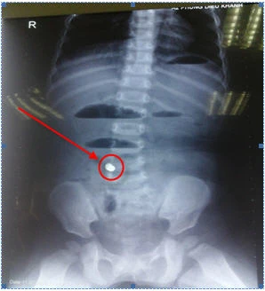 Bệnh nhi là cháu P.D.K 14 tháng tuổi (ở Từ Liêm, Hà Nội), nhập viện ngày 10-2 trong tình trạng mệt mỏi, nôn dịch vàng, bụng mềm, chướng nhẹ, ấn đau trên rốn. Theo người nhà, khoảng ba ngày trước khi nhập viện, trẻ quấy khóc, ăn uống kém hơn những ngày trước đó. Ngày 10-2, trẻ có quấy khóc tăng lên, kèm theo nôn dịch màu xanh sau ăn uống, trẻ không đi ngoài được trong ba ngày trước khi vào viện. Bố mẹ cháu cho biết, trước đó cháu có chơi chiếc mũ vương miện, có khả năng trẻ vô tình nuốt phải các hạt nhỏ đính trên mũ mà gia đình không biết.