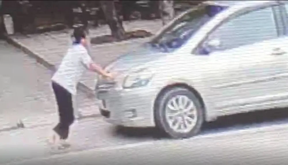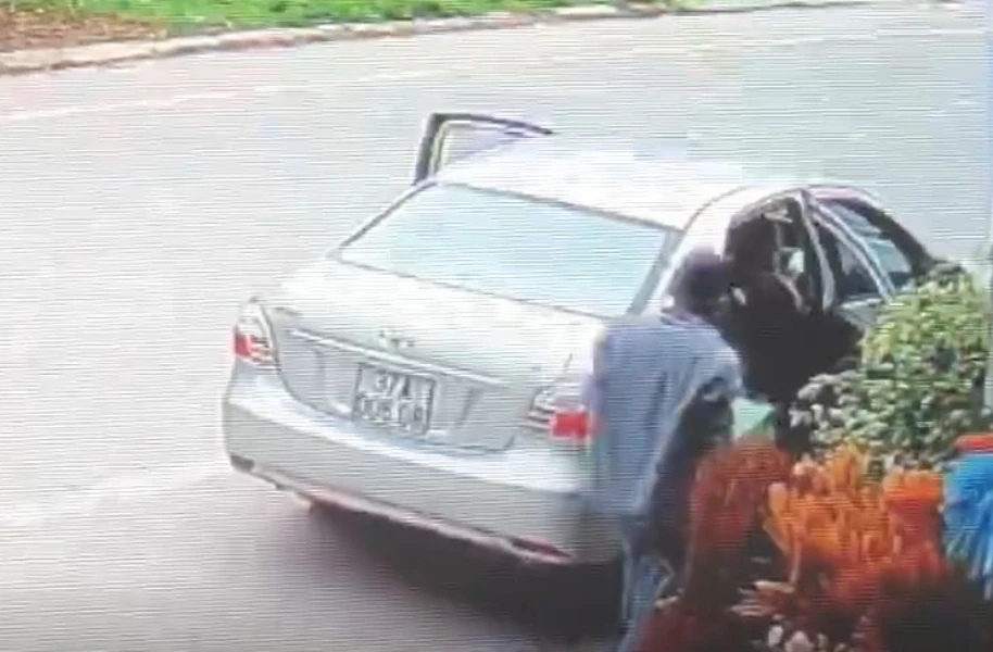Cháu PLN chặn trước xe hơi để bắt người đàn ông cướp 2 két bia. Ảnh cắt từ video clip.