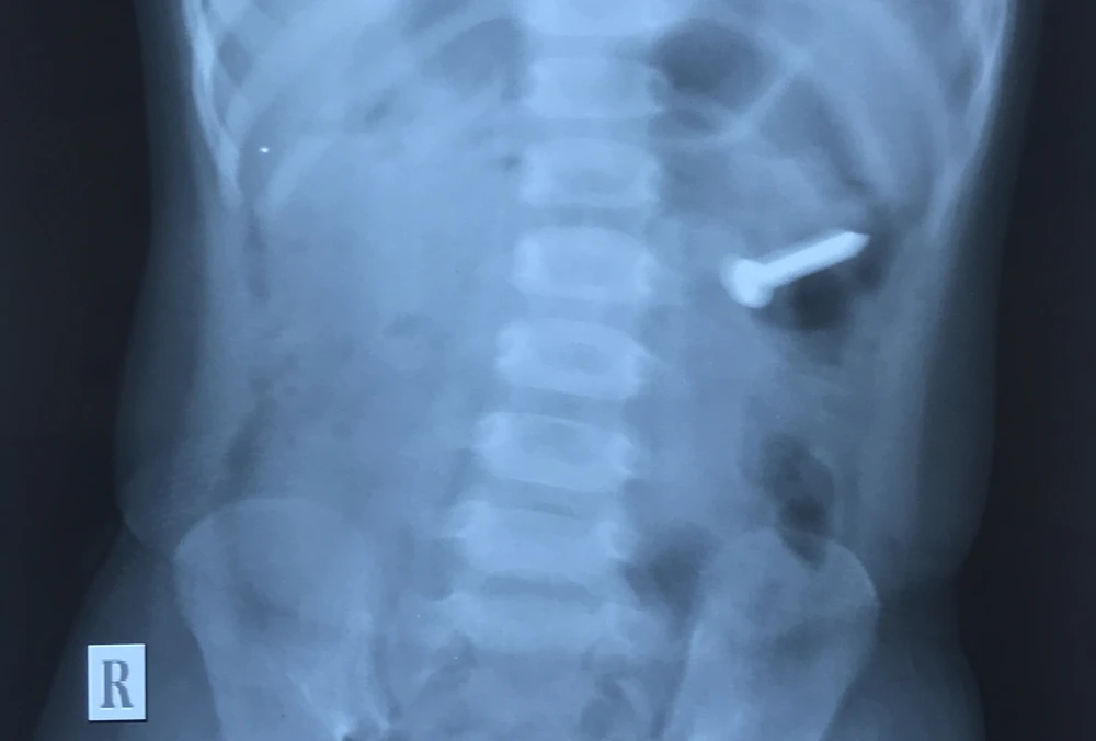 Trước đó, bé U. được người nhà đưa đến BV nói trên trong tình trạng quấy khóc liên tục, buồn nôn. Gia đình cho biết bé U. cầm chơi chiếc đinh ốc xoắn và đã nuốt.